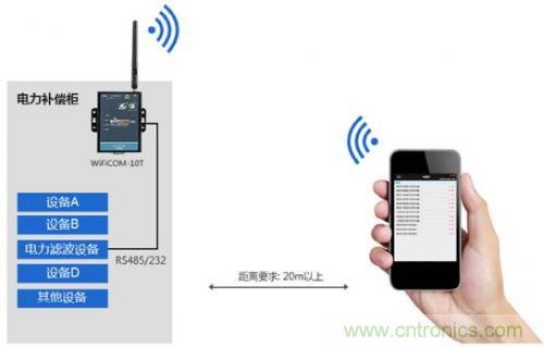 電力補(bǔ)償裝置的巡檢一般需要人工開(kāi)柜進(jìn)行數(shù)據(jù)的查看、調(diào)整等操作,工作繁瑣切具有一定危險(xiǎn)性,本項(xiàng)目利用WiFiCOM-10T串口轉(zhuǎn)Wi-Fi模塊,在傳統(tǒng)裝置的基礎(chǔ)上利用原有的RS-485/232通訊接口快速進(jìn)行產(chǎn)品升級(jí),將串口數(shù)據(jù)轉(zhuǎn)化成Wi-Fi信號(hào),巡檢人員即可通過(guò)手機(jī)或iPad進(jìn)行設(shè)備巡檢,并實(shí)現(xiàn)遙控、遙測(cè)、遙信等功能。