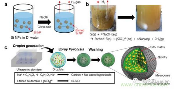 將Si材料與石墨復合也是克服Si體積膨脹的重要途徑,也是目前唯一上也化運用的方法。來自中科院過程所的Wenfeng Ren等[5]提出了一中新型的Si-C樹枝狀復合結構,如下圖所示。該方法首先在工業級多晶硅的表面分散一層銅基催化劑,然后在CH3Cl氣氛下,利用該催化劑對Si基體進行腐蝕,最終獲得樹枝狀的Si材料,這些Si晶體之間的空隙能夠很好的吸收體積膨脹,同時CH3Cl分解后會在Si表面形成一層無定形碳對Si形成保護,該材料在50mA/g的電流密度下,比容量可以達到849mAh/g,并具有良好的循環性能。