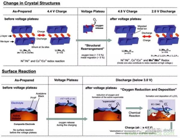 富鋰材料容量高,并且還具有低成本的優(yōu)勢,可以說是非常理想的鋰離子電池正極材料,當然任何事情都不可能是完美的,在首次使用的過程中為了發(fā)揮出富鋰材料的高容量,要采用高電壓活化,這一過程中除了形成我們需要的Li2MnO3物相外,也會生成Li2O,還會釋放活性氧,這不僅會破壞富鋰材料自身的結(jié)構(gòu),還會導致電解液的氧化分解,造成較高的不可逆容量。此外富鋰材料在循環(huán)過程中還存在著層狀結(jié)構(gòu)向尖晶石結(jié)構(gòu)轉(zhuǎn)變的趨勢,這也導致富鋰材料的電壓平臺在循環(huán)過程中會持續(xù)的下降,容量不斷衰減,使得富鋰材料循環(huán)性能較差,反應(yīng)機理如下圖所示。