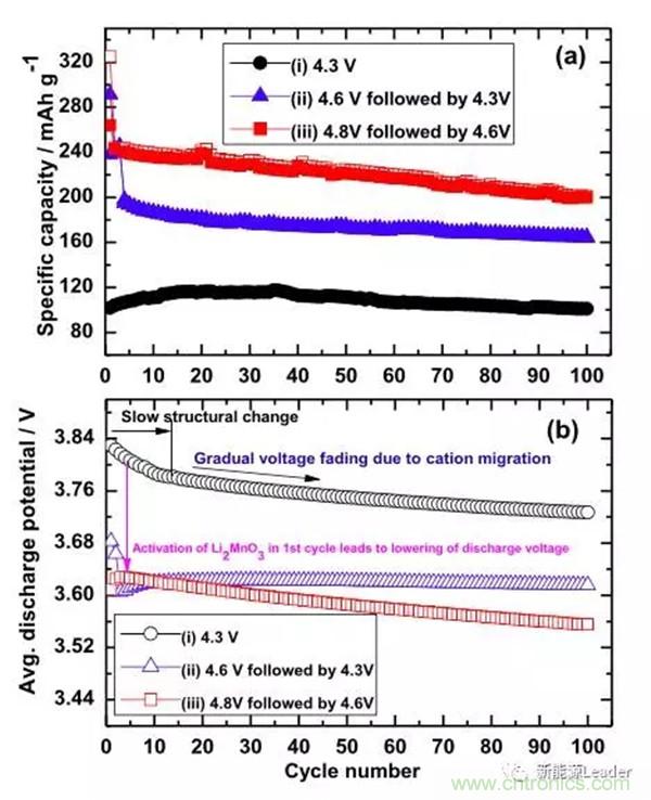 富鋰材料活化制度是影響其循環(huán)性能的一個重要因素,以色列科學家Prasant Kumar Nayak等研究顯示,活化電壓和循環(huán)電壓對于富鋰材料的循環(huán)性能都有十分顯著的影響,例如他們發(fā)現(xiàn)Li1.17Ni0.25Mn0.58O2在經(jīng)過4.8V活化,并在2.3-4.6V之間循環(huán)的電池,雖然容量高達242mAh/g,但是循環(huán)性能很差,并且循環(huán)100次后電壓平臺從3.62V衰降到了3.55V,而經(jīng)過4.6V活化,并在2.3V-4.3V之間循環(huán)的電池,雖然比容量較低僅為160mAh/g,但是循環(huán)性能優(yōu)異,并且循環(huán)100次未出現(xiàn)平臺電壓衰降,如下圖所示,而沒有經(jīng)過高電壓活化的材料,容量較低僅為100mAh/g左右,可見富鋰材料的活化制度和循環(huán)制度對于富鋰材料的循環(huán)具有巨大的影響。