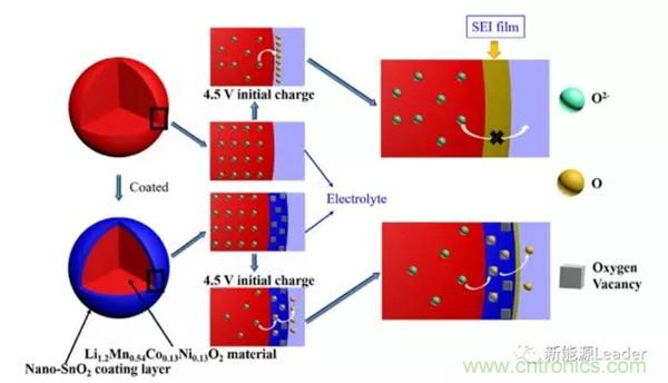 富鋰材料界面穩(wěn)定性差,容易導致副反應(yīng)的發(fā)生,影響電池的循環(huán)壽命,一種有效的解決辦法就是“表面包覆”,例如AlF3、Al2O3和Li3PO4等材料都可以用于富鋰材料的表面包覆,改善富鋰材料的表面穩(wěn)定性。哈工大的杜春雨等等提出了一種SnO2包覆方案,他們利用了SnO2中的氧缺位,促進Li2MnO3結(jié)構(gòu)的形成,不僅改善了富鋰材料的循環(huán)性能和倍率性能,還提高了富鋰的材料的容量,達到了264.6mAh/g,相比于沒有包覆處理的富鋰材料提高了38.2mAh/g,這也為富鋰材料表面改性處理提供了一個新的思路。