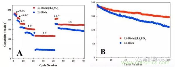 華南師范大學的Dongrui Chen等借助聚多巴胺模版法,利用Li3PO4對富鋰材料進行了包覆處理,Li3PO4包覆層的厚度僅為5nm左右。Li3PO4包覆層極大的改善了富鋰的材料的循環(huán)性能,0.2C,2.0-4.8V循環(huán)100次,容量保持率為78%,而沒有經(jīng)過包覆處理的富鋰材料容量保持率僅為58%,同時Li3PO4包覆層也顯著提高了富鋰的材料的倍率性能,如下圖所示。