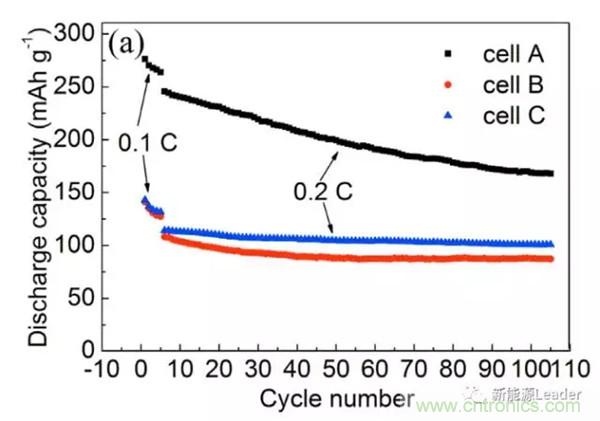 富鋰材料的低溫性能也是阻礙富鋰材料應(yīng)用的一個重要因素,中國工程物理研究院的Guobiao Liu等對于富鋰材料低溫下容量下降的機理做了詳細的研究,一般認為,富鋰材料在低溫下由于活化產(chǎn)生的Li2MnO3材料的數(shù)量較少,導致容量偏低,但Guobiao Liu的研究發(fā)現(xiàn),即便是材料內(nèi)的Li2MnO3含量較高,在低溫下容量發(fā)揮也很低,Li2MnO3含量并不是影響材料容量發(fā)揮的決定性因素,Guobiao Liu認為低溫下較差的電極動力學特性會抑制Mn4+/Mn3+反應(yīng),從而導致材料的容量發(fā)揮較低。循環(huán)性能研究顯示,雖然低溫導致富鋰材料的容量發(fā)揮較低,但是卻顯著的提升了富鋰材料的循環(huán)性能,如下圖所示(電池A在25℃下循環(huán),含有較多數(shù)量的Li2MnO3,電池B,在低溫-20℃下循環(huán)含有較少數(shù)量的Li2MnO3,電池C首先在25℃下活化,然后在-20℃下循環(huán),含有數(shù)量較多的Li2MnO3)。A、B和C三種電池在循環(huán)100次后,容量保持率分別為68.3%、80.9%和88.1%,通過對三種電池中的富鋰材料的結(jié)構(gòu)研究顯示,低溫很好的抑制了富鋰材料從層狀結(jié)構(gòu)向尖晶石結(jié)構(gòu)轉(zhuǎn)變,從而顯著改善了富鋰材料的循環(huán)性能。