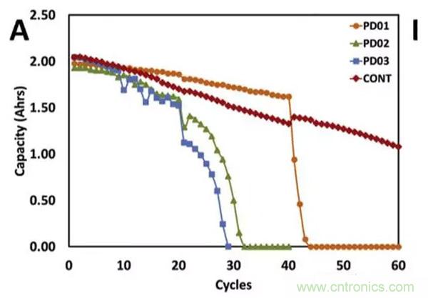 針對三個階段電池的衰降機理的研究認為,階段1可能是因為電池SEI膜生長需要消耗一部分Li+,因此衰降速度較快。在階段2隨著SEI膜結構的穩定,內部較為穩定,因此衰降速度較慢,在階段3隨著電池老化,開始發生活性物質損失,電極活性界面減少,導致電池對于電流十分敏感。圖C是針對不同的截止電壓對電池衰降速度影響的實驗,從實驗結果可以看到,當把充電截止電壓提高到4.3V時會導致電池的循環性能急劇惡化,降低充電截止電壓可以有效的改善電池的循環性能。