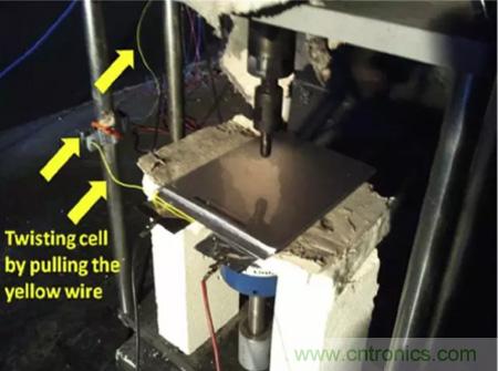 目前能夠模擬鋰離子電池內(nèi)短路的方式有多種,例如針刺測試,小壓痕測試,BAJ測試和機械擠壓測試等,通過對大尺寸方形電池特點的分析,Hsin Wang認為機械擠壓測試最適合應用方形鋰離子電池的測試上。但是在傳統(tǒng)的擠壓的測試中由于電池受到的破壞太大,幾乎所有的電池都會發(fā)生熱失控,因此傳統(tǒng)的擠壓測試對不同種類電池安全性的“分辨率”就很低,只有通過和不通過兩種結果,只能對鋰離子電池的安全性進行定性分析??赡軆蓚€電池都沒有通過安全性測試,但是A電池的安全性卻要好于B電池,為了能夠準確的評估不同體系電池的安全性能,Hsin Wang對傳統(tǒng)的擠壓實驗進行了改進,通過在電池負極極耳上施加一個拉力,讓電池產(chǎn)生大約5°的扭曲,從而減少在擠壓過程中電池受到的破壞,因此該實驗能夠準確的評估不同種類電池的的安全性高低。