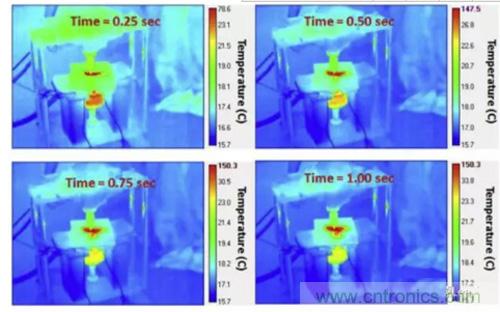 下圖為60%SoC的NMC電池在擠壓-扭轉(zhuǎn)實驗中的熱成像圖,從圖中可以看到在短路發(fā)生后,短路點的溫度在0.5S內(nèi)迅速升高到了147.5 ℃,隨后高溫區(qū)域迅速向周圍擴展,說明周圍區(qū)域溫度升高并不是由熱傳導導致的,而是高溫引發(fā)了其他的化學反應。而在80%SoC下,NMC電池發(fā)生熱失控的溫度更高,引起周圍化學反應的速度也更快。