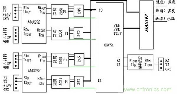 經過分析,我們分別使用一塊2051單片機接收各路串口傳感器的數據,同時使用一塊多路高精度ADC對轉換成電壓的溫度等信號采樣,系統結構圖如圖1所示。主從機之間的具體管腳連接參見圖2。