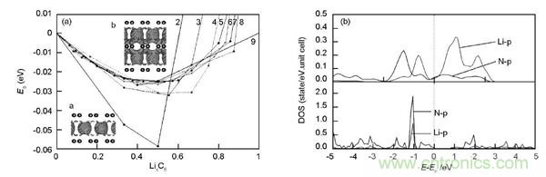 圖5.不同結構石墨烯與Li相互作用:(a)少層石墨烯; (b) Li與摻N石墨烯的態(tài)密度