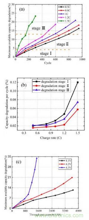 從數(shù)據(jù)可以看到,隨著充電的倍率的加大,鋰離子電池的衰降速率也在快速增加,并且從曲線的斜率來(lái)看,電池的衰降速度存在三個(gè)不同的階段,前期衰降速度較快的階段(階段1),中間衰降速度較慢的穩(wěn)定階段(階段2),和后期的衰降速率加速階段(階段3)。針對(duì)三個(gè)階段電池的衰降機(jī)理的研究認(rèn)為,階段1可能是因?yàn)殡姵豐EI膜生長(zhǎng)需要消耗一部分Li+,因此衰降速度較快。在階段2隨著SEI膜結(jié)構(gòu)的穩(wěn)定,內(nèi)部較為穩(wěn)定,因此衰降速度較慢,在階段3隨著電池老化,開始發(fā)生活性物質(zhì)損失,電極活性界面減少,導(dǎo)致電池對(duì)于電流十分敏感。圖C是針對(duì)不同的截止電壓對(duì)電池衰降速度影響的實(shí)驗(yàn),從實(shí)驗(yàn)結(jié)果可以看到,當(dāng)把充電截止電壓提高到4.3V時(shí)會(huì)導(dǎo)致電池的循環(huán)性能急劇惡化,降低充電截止電壓可以有效的改善電池的循環(huán)性能。