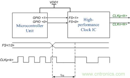高性能時鐘設備支持包含個性化配置的多個用戶配置文件。在 FS 引腳轉換方面,高性能時鐘器件具有兩個時序規格 - 快速切換和慢速切換。