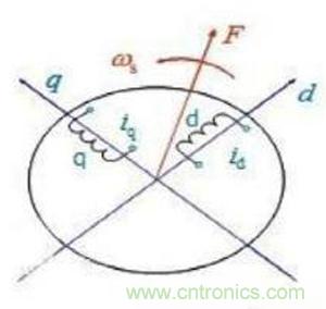 當圖1和2的兩個旋轉磁動勢大小和轉速都相等時,即認為圖2的兩相繞組與圖1的三相繞組等效。圖3兩個匝數相等且互相垂直的繞組d 和q,其中分別通以直流電流id和iq,產生合成磁動勢F,其位置相對于繞組來說是固定的。如果讓包含兩個繞組在內的整個鐵心以同步 轉速旋轉,則磁動勢F自然也隨之旋轉起來,成為旋轉磁動勢。把這個旋轉磁動勢的大小和轉速也控制成與圖1 和圖2中的磁動勢一樣,那么這套旋轉的直流繞組也就和前面兩套固定的交流繞組都等效了。