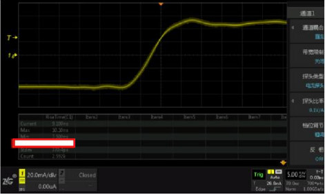 測試電流探頭的上升時間使用的測試儀器是信號發生器Keysight33600和示波器ZDS2022。信號發生器產生上升時間為5ns的方波,示波器顯示經過電流探頭后的上升波形和時間。