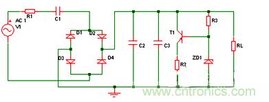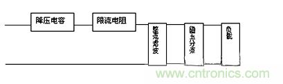 D1作半波整流用,C2、C3為濾波電容,交流電源U上半周時,經C1、R1降壓,由D1整流后給電容C2平滑濾波輸出