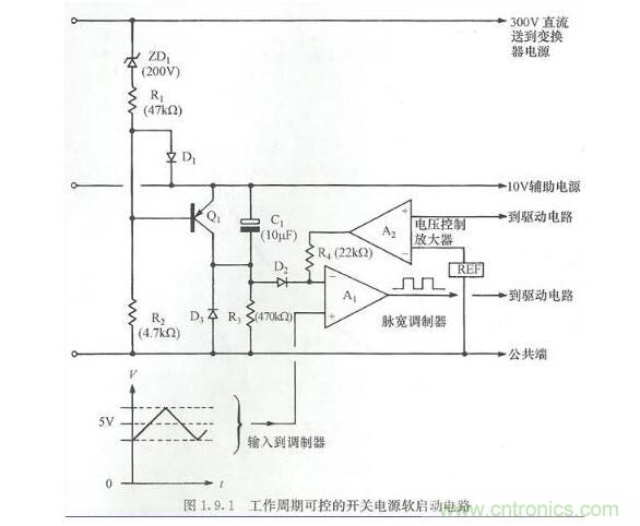 當(dāng)首次接上開(kāi)關(guān)電源時(shí),C1將放電。10V開(kāi)關(guān)電源線上逐漸增大的電壓將使放大器A1反相輸入端為正,禁止脈寬調(diào)制器的輸出。晶體管Q1將通過(guò)R2導(dǎo)通,保持C1放電狀態(tài)直到送到變換器電路的300V直流線上形成的電壓超過(guò)200V。