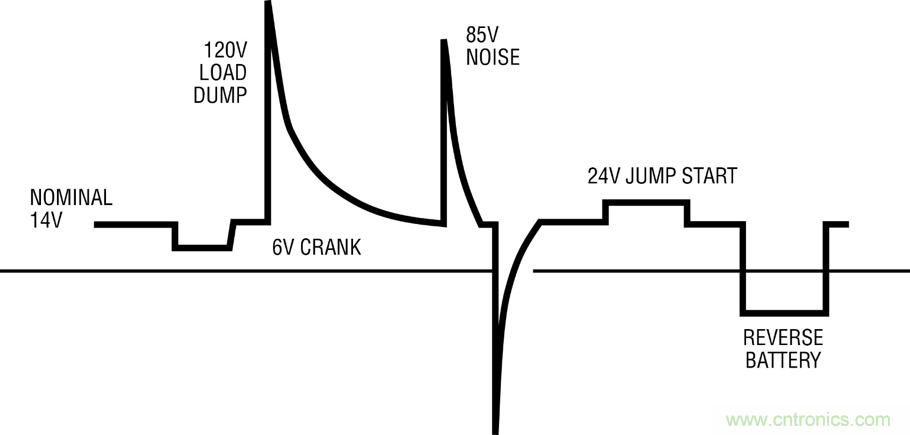 交通運(yùn)輸系統(tǒng)的輸入電壓可能高達(dá) 14V (單電池供電汽車)28V (雙電池供電卡車、客車和飛機(jī))、或更高電壓,而其數(shù)字系統(tǒng)需要一個(gè)或更多個(gè)低壓軌。因此,設(shè)計(jì)這類系統(tǒng)時(shí),需要了解怎樣才能簡(jiǎn)便、高效可靠地從很高的輸入電壓降壓。以下圖 1 顯示,汽車環(huán)境中的輸入電壓可能視其運(yùn)行狀態(tài)的改變而改變,而其運(yùn)行狀態(tài)可能包括負(fù)載突降變化到冷車發(fā)動(dòng)的各種情況,甚至出現(xiàn)電池反向連接。