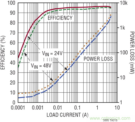 2LTC3895 原理圖以及效率隨功率損耗變化的曲線