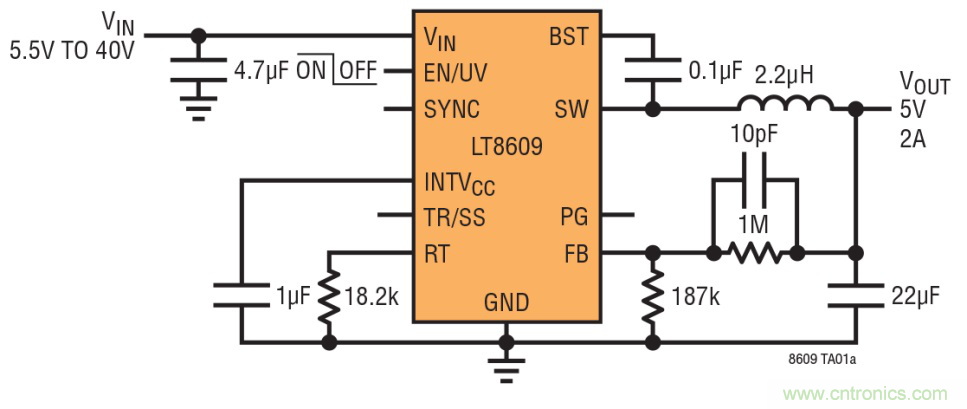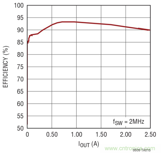一個(gè)很好的例子是 LT8609,這是一款 2A42V 輸入同步降壓型開關(guān)穩(wěn)壓器。獨(dú)特的同步整流拓?fù)涮峁?93% 的效率,而以 2MHz 頻率切換使設(shè)計(jì)師能夠避開關(guān)鍵噪聲敏感頻段,例如 AM 無線電,同時(shí)可提供占板面積非常緊湊的解決方案。突發(fā)模式 (Burst Mode®) 運(yùn)行在無負(fù)載備用情況下保持靜態(tài)電流低于 2.5μA,從而使該器件非常適合始終保持接通的系統(tǒng)。LT8609 3.0V 42V 輸入電壓范圍使其非常適合汽車應(yīng)用,這類應(yīng)用必須以低至 3.0V 的最低輸入電壓穩(wěn)定通過冷車發(fā)動(dòng)和停-啟情況,并穩(wěn)定通過超過 40V 的負(fù)載瞬態(tài)。其內(nèi)部 3.5A 開關(guān)可在峰值負(fù)載電流為 3A 時(shí),提供高達(dá) 2A 的連續(xù)輸出電流。原理圖和相應(yīng)于 2MHz 切換頻率的效率曲線如圖 3 所示。