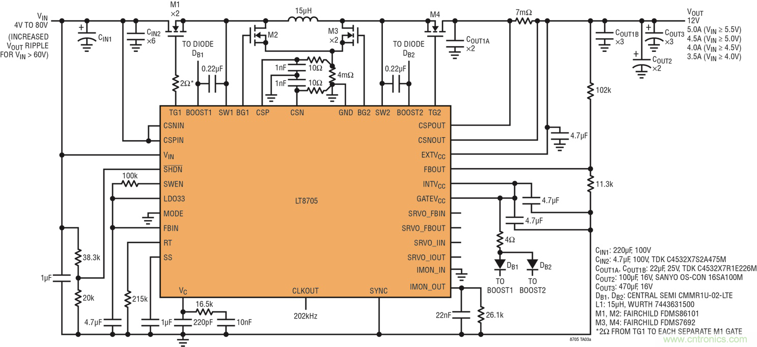 4:詳細(xì)的 LT8705 原理圖,從 4V 80V 輸入提供固定 12V 輸出