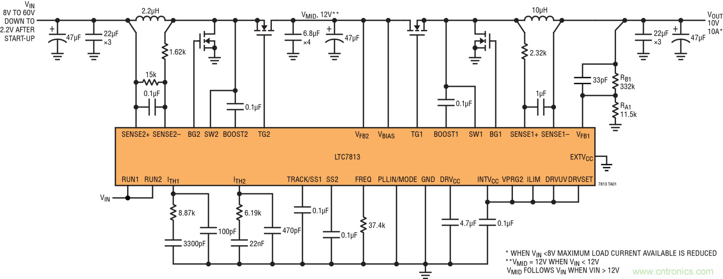 解決汽車?yán)滠嚢l(fā)動(dòng)問題的另一種方法是,采用升壓型轉(zhuǎn)換器,后面再跟一個(gè)降壓型轉(zhuǎn)換器。在這種拓?fù)渲校瑥膯坞姵靥峁┑纳龎盒娃D(zhuǎn)換器輸出設(shè)定為比電池的標(biāo)稱電壓高出幾伏,然后再用一個(gè)降壓型轉(zhuǎn)換器對(duì)其降壓,使其達(dá)到下游電子組件所需的工作電壓。盡管這種方法需要兩個(gè)轉(zhuǎn)換器,但是ADI公司已經(jīng)開發(fā)出一款整合了升壓型控制器和降壓型控制器的器件,兩個(gè)控制器既可獨(dú)立使用,又可作為升壓-降壓跟隨器使用。圖 5 中用LTC7813 說明這種器件的工作原理。