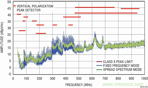 因此,很顯然的是,低輻射是很多汽車和交通運(yùn)輸設(shè)備制造商的關(guān)鍵要求。系統(tǒng)設(shè)計(jì)師怎樣才能滿足汽車 CISPR 25Class 5 (6 所示) 的嚴(yán)格要求,同時(shí)仍然保持高效率和很小的解決方案尺寸呢?