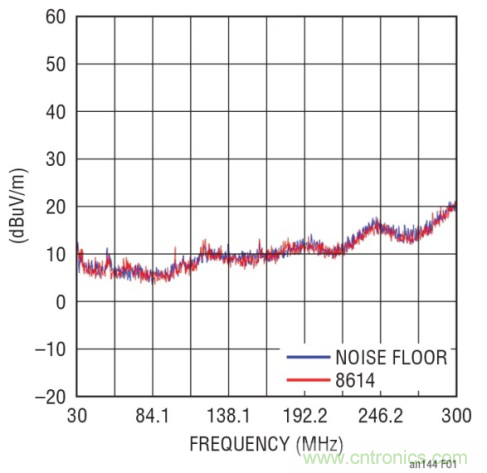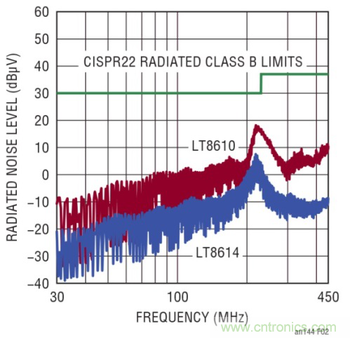 一種答案也許是采用ADISilent Switcher® 系列器件。以 LT8614 為例,這是一款42V 輸入、4A 輸出、單片降壓型轉(zhuǎn)換器,以高于 2MHz 的開關(guān)頻率和 94% 的轉(zhuǎn)換效率切換,由于其很短的 30ns 最短接通時(shí)間,因此可滿足 16V 輸入至 1.8V 輸出降壓比。此外,由于采用了已獲專利的 Silent Switcher 技術(shù),所以該器件可超越 CISPR 25 CISPR 22 Class B輻射要求,如圖 7 所示。