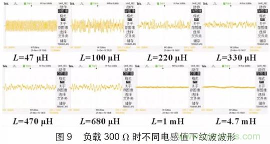 圖9 所示為負載為300 Ω 時不同電感值下紋波波形圖,從圖9 中可以看出,隨電感值增大,紋波被抑制程度越大,輸出紋波越小。當電感值增大到1 mH 時,紋波效果最好,且輸出基本上沒有毛刺。