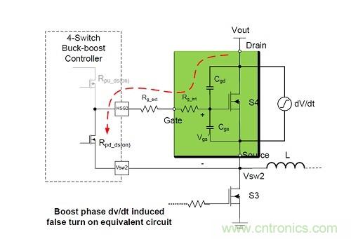 在4開關降壓-升壓轉換器中,dv/dt電感導通是由同步整流MOSFET在降壓段和升壓段快速升高的漏源電壓引起的。由于不需要的擊穿電流流過任一相橋臂,結果導致整個系統(tǒng)能效下降。電源設計人員可采用幾種經濟的電路方案,包括最小化整流開關的關斷門極驅動電阻,增加有源開關的導通門極驅動電阻,或在開關節(jié)點加入RC緩沖電路。選擇具有低Qgd/Qgs(th)比率和高閾值電壓的MOSFET也可降低dv/dt電感誤導通的可能性。