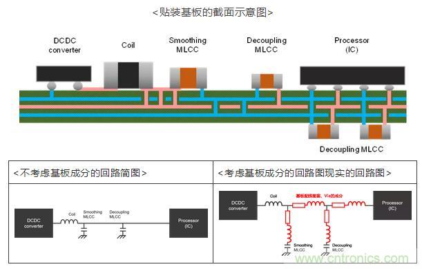 除了去耦電容的最佳選定和最佳結構化之外,貼裝基板的圖案設計對電源線路的低阻抗化也有重要作用。貼裝基板的線路用導體圖案和通孔中存在電阻成分、寄生電感和雜散電容,在電源線路的阻抗設計中,基板本身的電氣成分也需要作為阻抗成分的一部分在基板圖案設計中加以考慮。