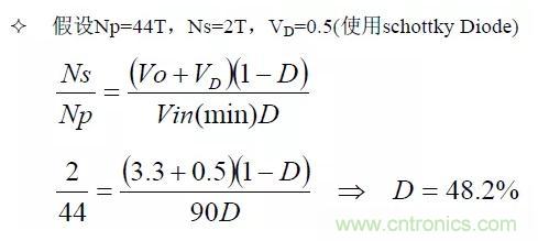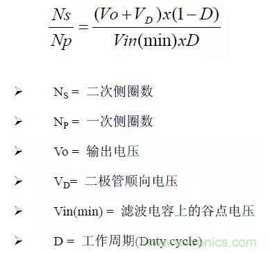 依據變壓器的圈比關系,可以初步計算出變壓器的應力(Stress)是否符合選用零件的規格,計算時以輸入電壓264V(電容器上為380V)為基準。