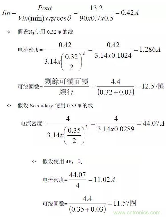 當變壓器決定后,變壓器的Bobbin即可決定,依據Bobbin的槽寬,可決定變壓器的線徑及線數,亦可計算出線徑的電流密度,電流密度一般以6A/mm2為參考,電流密度對變壓器的設計而言,只能當做參考值,最終應以溫升記錄為準。