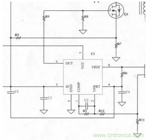 濾除3843 Pin3腳的噪聲,R5一般使用1KΩ 1/8W,C3一般使用102P/50V的陶質電容,C3若使用電容值較小者,重載可能不開機(因為3843 Pin3瞬間頂到1V);若使用電容值較大者,也許會有輕載不開機及短路Pin過大的問題。