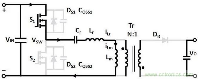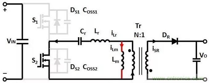 T4時刻,同時關斷SR和S2,(Coss1+Coss2)和(Lr+Lm)諧振,Coss1放電,Coss2充電,直到T5時刻,Coss2的電壓充電到VIN,Coss1的電壓放電到0。