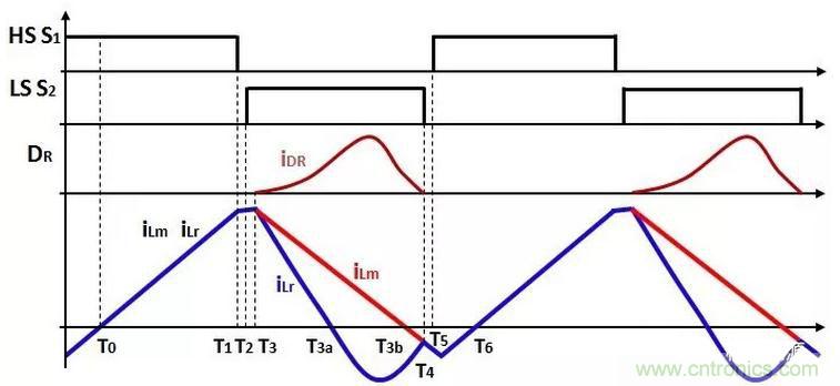 在這個階段,Lr和Cr串聯諧振,iLr過0后,反向繼續諧振;然后,經過一段時間, iLm也過0,反向激磁繼續增加。