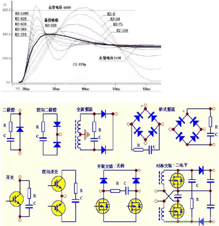 比如對(duì)二極管反壓的吸收,即使其他情況完全相同,使用不同的二極管型號(hào)需要的RC吸收參數(shù)就可能有很大差距。很難推導(dǎo)出一個(gè)通用的計(jì)算公式出來(lái)。