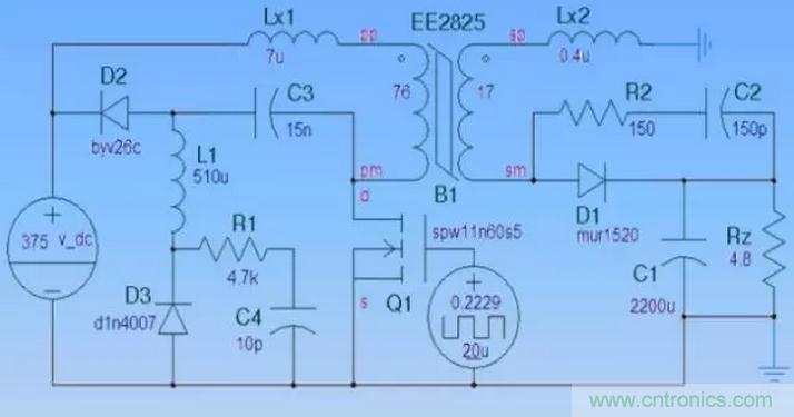 同時(shí)將Q1、D1的電壓尖峰、振鈴減少到最低程度。