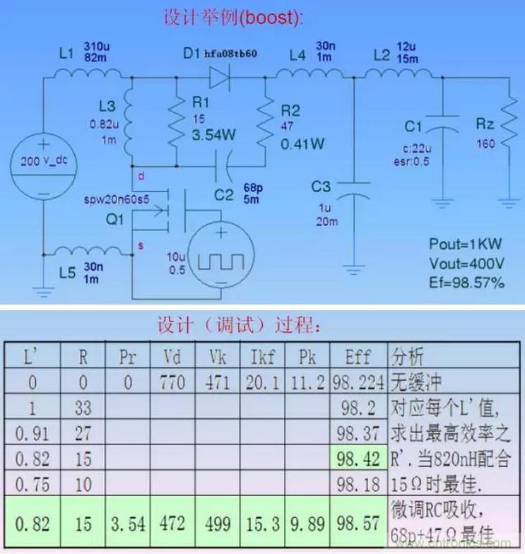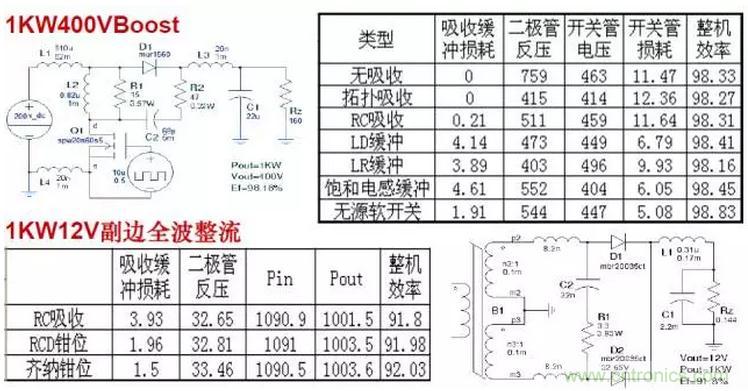 無(wú)源無(wú)損軟開(kāi)關(guān)電路效率明顯高于其他緩沖吸收方式,與有源軟開(kāi)關(guān)電路效率相差無(wú)幾。因此只要能夠?qū)崿F(xiàn)無(wú)源軟開(kāi)關(guān)的電路,可不必采用有源軟開(kāi)關(guān)。