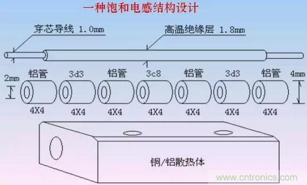 在其他條件相同情況下,相同體積的磁芯的飽和電感緩沖效果大致相當(dāng)。既然如此,磁芯可以按照最有利于散熱的磁路進(jìn)行設(shè)計(jì)。比如細(xì)長(zhǎng)的管狀磁芯比環(huán)狀磁芯、多個(gè)小磁芯比集中一個(gè)大磁芯、穿心電感比多匝電感顯然具有更大的散熱表面積。
