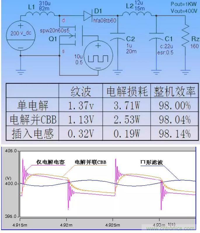 提出的辦法是:用電感將電解和CBB分開(kāi),CBB位于高頻紋波電流側(cè),電解位于直流(工頻)側(cè),各自承擔(dān)對(duì)應(yīng)的濾波任務(wù)。