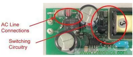 圖1是這些非計劃中電容的一個實例。圖中的右側是一個垂直安裝的FET,所帶的開關節點與鉗位電路延伸至了圖片的頂部。輸入連接從左側進入,到達距漏極連接1cm以內的位置。這就是故障點,在這里FET的開關電壓波形可以繞過EMI濾波器耦合至輸入。