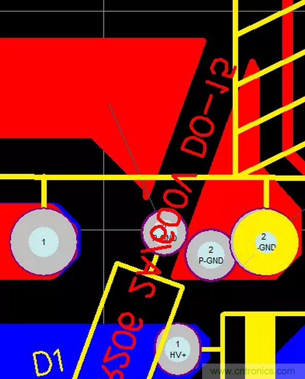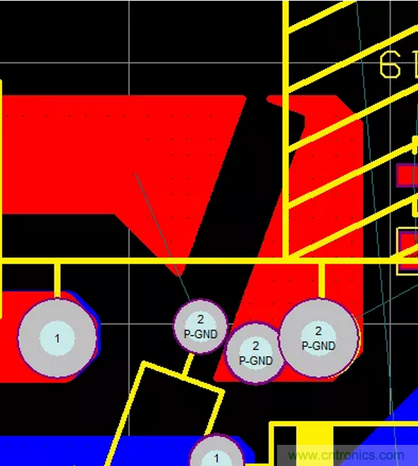 47.PCB的熱點區域一定要遠離輸入、輸出端子,防止噪聲源串到線上導致EMI變差,在不得已而為之時,可增加地線或其它屏蔽方式進行隔離,如下圖增加了一條地線進行有效隔離。