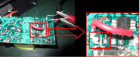 通過斷開PCB銅箔使用一根導線連到輸出電容地,隔開ME4312B芯片地,如下圖: