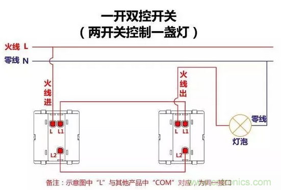 有的朋友說中間可不可以用雙聯雙控開關,也是可以的。不過雙聯開關上有兩個開關,需用同時按下。