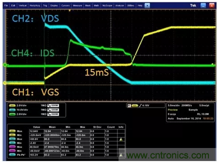 根據(jù)系統(tǒng)浪涌電流和di/dt的要求,使用上面公式就可以求出外加的電容CGS1,由此選取相應(yīng)的標準電容值。不同的CGS1值可以改變過沖的峰值浪涌電流的大小。