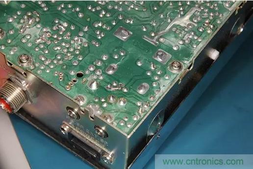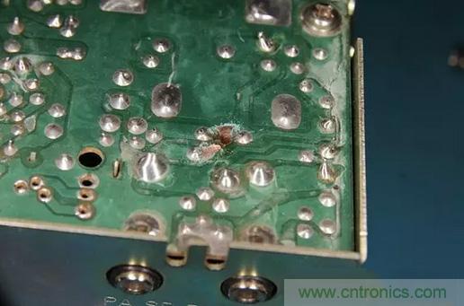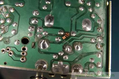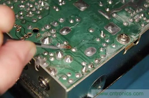 很自然地,保險絲會熔斷,但大家又不總是會用相同額定電流的保險絲來替換。通常情況下,他們會用更高額定電流的保險絲來做替換。所以,當收音機仍然反向連接電源,就會出現保險絲沒有熔斷,PCB電路板上走線有燒斷的現象。如下圖所示。