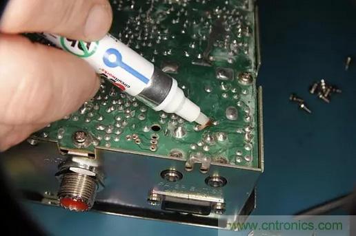 接下來修剪多余的電線至焊點處,并用助焊劑清潔劑對焊點進行清理。