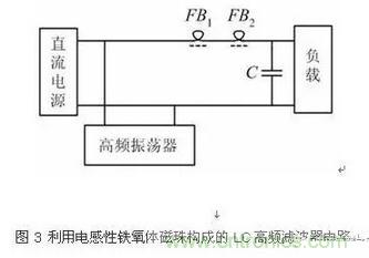 由于鐵氧體磁珠在電路中使用能夠增加高頻損耗而又不引入直流損耗,而且體積小、便于安裝在區(qū)間的引線或者導線上,對于1MHz以上的噪聲信號抑制效果十分明顯,因此可用作高頻電路的去耦、濾波以及寄生振蕩的抑制等。特別對消除電路內部由開關器件引起的電流突變和濾波電源線或其它導線引入電路的高頻噪聲干擾效果明顯。低阻抗的供電回路、諧振電路、丙類功率放大器以及可控硅開關電路等,使用鐵氧體磁珠進行濾波都是十分有效的。鐵氧體磁珠一般可以分為電阻性和電感性兩類,使用時可以根據需要選取。單個磁珠的阻抗一般為十至幾百歐姆,應用時如果一個衰減量不夠時可以用多個磁珠串聯(lián)使用,但是通常三個以上時效果就不會再明顯增加了[7]。如圖3示出了利用兩只電感性鐵氧體磁珠構成的高頻LC濾波器電路,該電路可有效的吸收由高頻振蕩器產生的振蕩信號而不致竄入負載,并且不降低負載上的直流電壓。