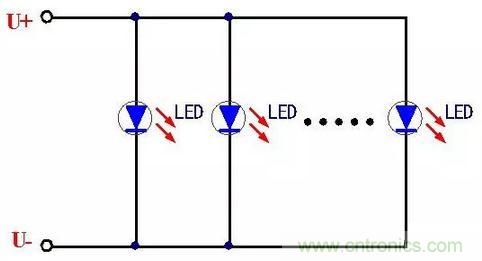 這種串聯(lián)連接的方式電路比較簡(jiǎn)單,首尾連接在一起,LED工作時(shí)流過(guò)的電流一致很好,由于LED屬于電流型器件,因此基本可以保證每個(gè)LED的發(fā)光強(qiáng)度一致。采取這種LED連接方式的電路簡(jiǎn)單、連接方便。但是也有一個(gè)致命的缺點(diǎn),那就是當(dāng)其中一個(gè)LED發(fā)生開(kāi)路故障時(shí),將造成整個(gè)LED燈串的熄滅,影響了使用的可靠性,這就需要保證每個(gè)LED的質(zhì)量過(guò)硬,這樣可靠性也就相應(yīng)的提高。