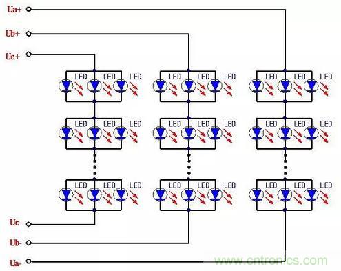 陣列方式主要構(gòu)成形式是:分支以3個(gè)LED為一組,分別接入驅(qū)動(dòng)器輸出的Ua,Ub,Uc輸出端。當(dāng)一分支中的3個(gè)LED都正常時(shí),3個(gè)LED同時(shí)發(fā)光;一旦其中有一個(gè)或兩個(gè)LED失效開(kāi)路時(shí),可以保證至少有一個(gè)LED的正常工作。這樣一來(lái)就能夠大大地提高了每組LED發(fā)光的可靠性,也就能夠提高整個(gè)LED發(fā)光的總體可靠性。采用這種方式需要多組輸入電源,目的是為了提高LED 工作的可靠性,降低整體電路故障發(fā)生率。