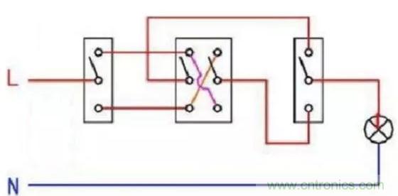 把兩個單刀雙擲開關的兩個觸點分別相連,即開關1的觸點1與開關2的觸點1相連,開關1的觸點2與開關2的觸點2相連,然后兩個開關的刀做為整個開關的兩端接入電燈的兩端。這樣當開關1和2的刀同時接打向各自觸點1或同時打向觸點2時,電路接通,則燈亮。若兩開關的刀一個打向觸點1而另一個打向觸點2時,電路不通,則燈滅。因此兩個開關都可以控制燈。兩個開關可以放在樓梯的上下兩端,或走廊的兩端,這樣可以在進入走廊前開燈,通過走廊后在另一端關燈,既能照明,又能避免人走燈不滅而浪費電。