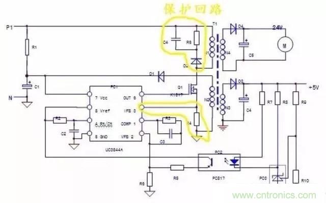 B.對UC3844單獨上電,短接PC2輸入側,若電路起振,說明故障在PC2輸入側外圍電路;電路不起振則檢查輸出側電路。